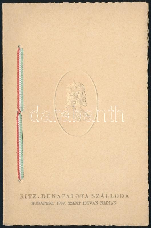 Leírás: 1939 Hotel Ritz Dunapalota Budapest illusztrált Szent István napi menükártya, mappa benne menülappal, magyar és francia nyelven,16x10 cm.