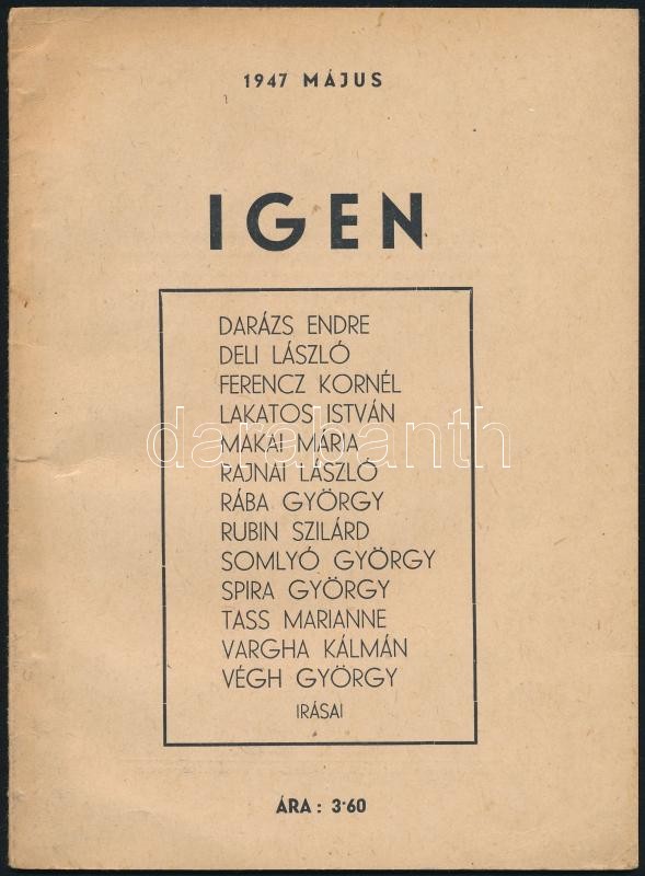 Igen. 1947. május. (Szerk. Rajnai László). (Bp.) 1947 (Márkus Ny.). 24 l. Kiadói papírborítóban. Poss. Spira György ex libris. Darázs Endre, Deli László, Ferencz Kornél, Lakatos István, Makai Mária, Rajnai László, Rába György, Rubin Szilárd, Somlyó György, Spira György,.Tass Marianne, Vargha Kálmán, Végh György írásai.
