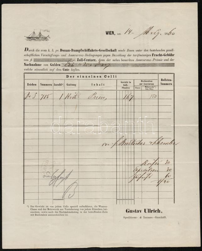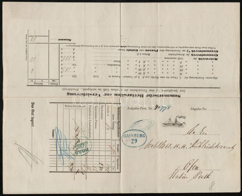 1860 DDSG fuvarlevél/ bil of lading ,,HAINBURG" - Ofen https://www.darabanth.com/hu/308-Gyorsarveres/308.0/Festmeny-mutargy-papirregiseg-egyeb/Okmanyok~16/1860-DDSG-fuvarlevel-bil-of-lading--HAINBURG--Ofen~II1670716