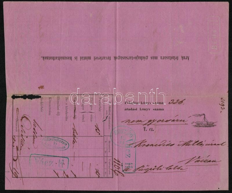 1867 Közép-dunai Gőzhajó Társaság fuvarlevél https://www.darabanth.com/hu/308-Gyorsarveres/308.0/Festmeny-mutargy-papirregiseg-egyeb/Okmanyok~16/1867-Kozep-dunai-Gozhajo-Tarsasag-fuvarlevel~II1670732