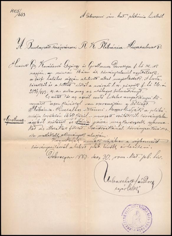 Leírás: 1883 Debrecen, Halálos ágyon kötött házasság és törvénytelen gyermek utólagos törvényesítéséről szóló okmány