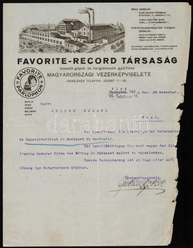 1921 Favorite-Record hanglemezgyár díszes fejléces számla, német nyel... https://www.darabanth.com/hu/308-Gyorsarveres/308.0/Festmeny-mutargy-papirregiseg-egyeb/Okmanyok~16/1921-Favorite-Record-hanglemezgyar-diszes-fejleces-szamla-nemet-nyelven-szelen-szakadasok~II1675124