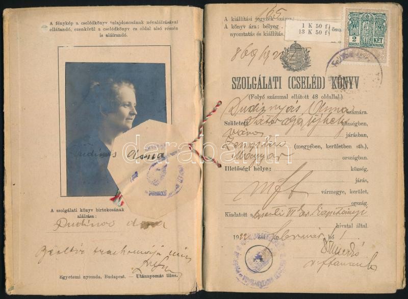 1922 Szolgálati cselédkönyv, fényképpel, okmánybélyeggel, kopottas bor... https://www.darabanth.com/hu/308-Gyorsarveres/308.0/Festmeny-mutargy-papirregiseg-egyeb/Okmanyok~16/1922-Szolgalati-cseledkonyv-fenykeppel-okmanybelyeggel-kopottas-boritoval~II1674855