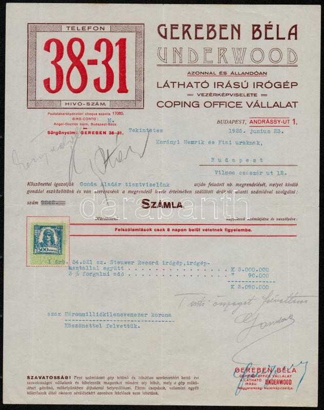 1925 Gerben Béla díszes fejléces számla, okmánybélyeggel, 29,5x23 cm https://www.darabanth.com/hu/308-Gyorsarveres/308.0/Festmeny-mutargy-papirregiseg-egyeb/Okmanyok~16/1925-Gerben-Bela-diszes-fejleces-szamla-okmanybelyeggel-29-5x23-cm~II1675152
