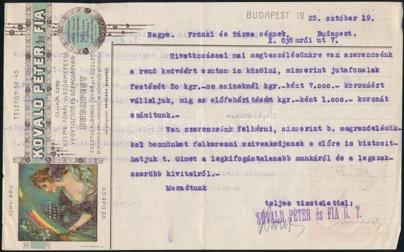 1925 Kovald Péter és Fia kelme- fonál- szőrmefestő vegytisztító és gőz... https://www.darabanth.com/hu/308-Gyorsarveres/308.0/Festmeny-mutargy-papirregiseg-egyeb/Okmanyok~16/1925-Kovald-Peter-es-Fia-kelme-fonal-szormefesto-vegytisztito-es-gozmosogyar-diszes-fe~II1674932