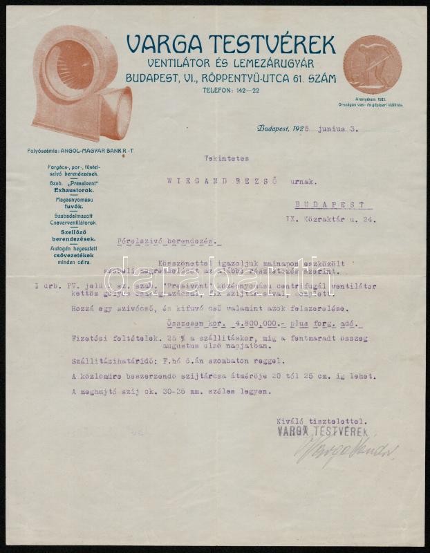 1925 Varga Testvérek Ventilátor és Lemezárugyár díszes fejléces számla... https://www.darabanth.com/hu/308-Gyorsarveres/308.0/Festmeny-mutargy-papirregiseg-egyeb/Okmanyok~16/1925-Varga-Testverek-Ventilator-es-Lemezarugyar-diszes-fejleces-szamla-30x23-5-cm~II1675316