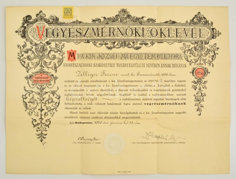 1926 Vegyészmérnöki diploma https://www.darabanth.com/hu/308-Gyorsarveres/308.0/Festmeny-mutargy-papirregiseg-egyeb/Okmanyok~16/1926-Vegyeszmernoki-diploma~II1652497