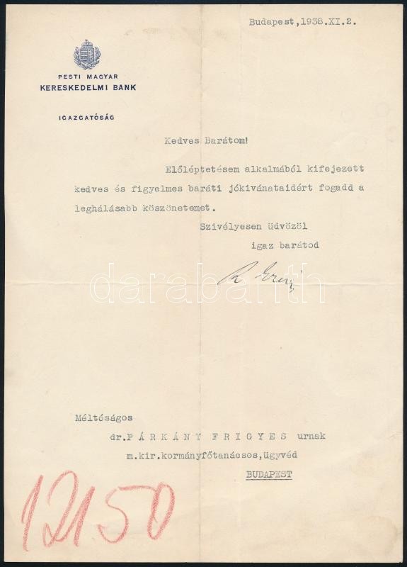 1938 Bp., A Pesti Magyar Kereskedelmi Bank Igazgatósága által írt elis... https://www.darabanth.com/hu/308-Gyorsarveres/308.0/Festmeny-mutargy-papirregiseg-egyeb/Okmanyok~16/1938-Bp-A-Pesti-Magyar-Kereskedelmi-Bank-Igazgatosaga-altal-irt-elismero-sorok-fejleces-levC3~II1673727