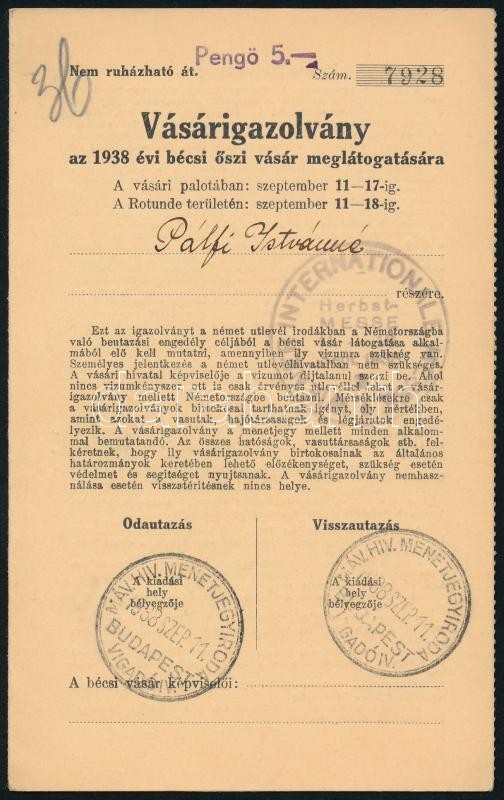 1938 Vásárigazolvány az 1938. évi bécsi őszi vásár meglátogatására, b... https://www.darabanth.com/hu/308-Gyorsarveres/308.0/Festmeny-mutargy-papirregiseg-egyeb/Okmanyok~16/1938-Vasarigazolvany-az-1938-evi-becsi-oszi-vasar-meglatogatasara-benne-ket-hasznala~II1675490