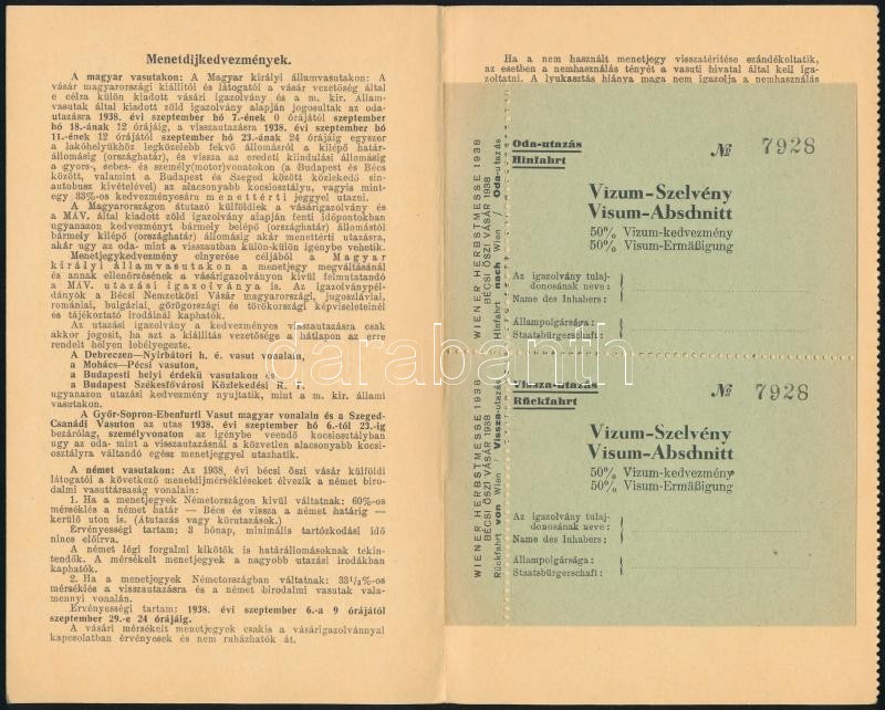 Leírás: 1938 Vásárigazolvány az 1938. évi bécsi őszi vásár meglátogatására, benne két használatlan 50%-os vízumszelvénye, jó állapotban