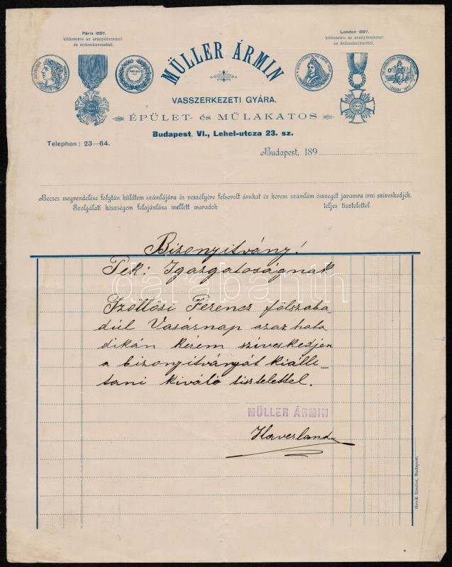 cca 1897 Müller Ármin vasszerkezeti gyára díszes fejléces számla, okmá... https://www.darabanth.com/hu/308-Gyorsarveres/308.0/Festmeny-mutargy-papirregiseg-egyeb/Okmanyok~16/cca-1897-Muller-Armin-vasszerkezeti-gyara-diszes-fejleces-szamla-okmanybelyeggel-30x23-5-c~II1675160