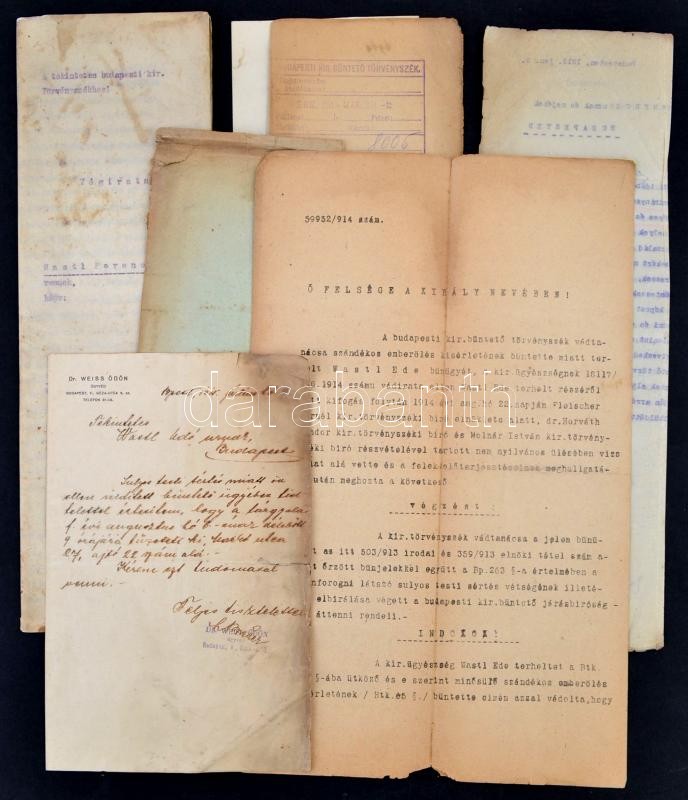 Leírás: cca 1910 Különféle peres iratok, irattöredékek: gyilkossági kísérlet, stb., összesen 5 db