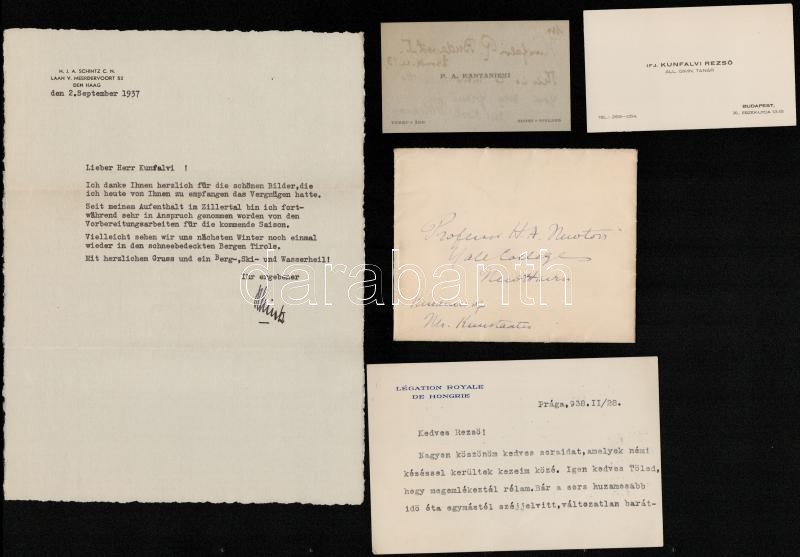 Leírás: cca 1938 Ifj. Kunfalvi Rezső névjegykártyája, neki címzett levelek, stb., 7 db