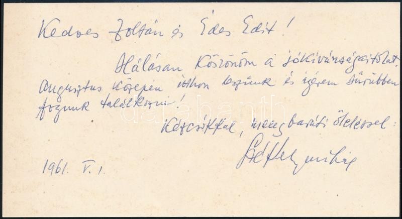 Leírás: 1961 Székely Mihály (1901-1963) operaénekes saját kézzel írt üdvözlő sorai.