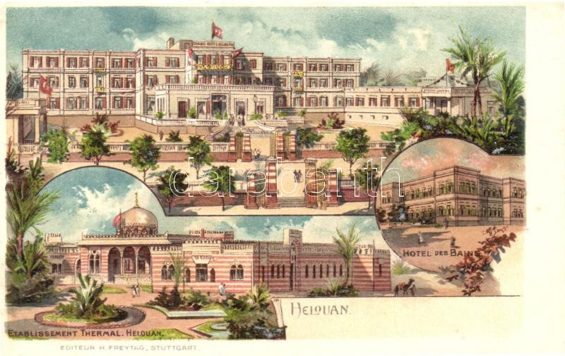 Leírás: Helwan, Helouan; Grand Hotel, Hotel des Bains, Etablissement Thermal; Editeur H. Freytag, litho