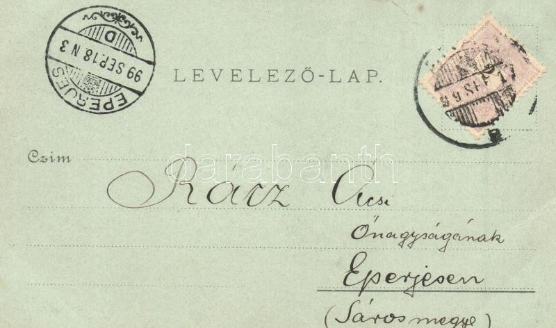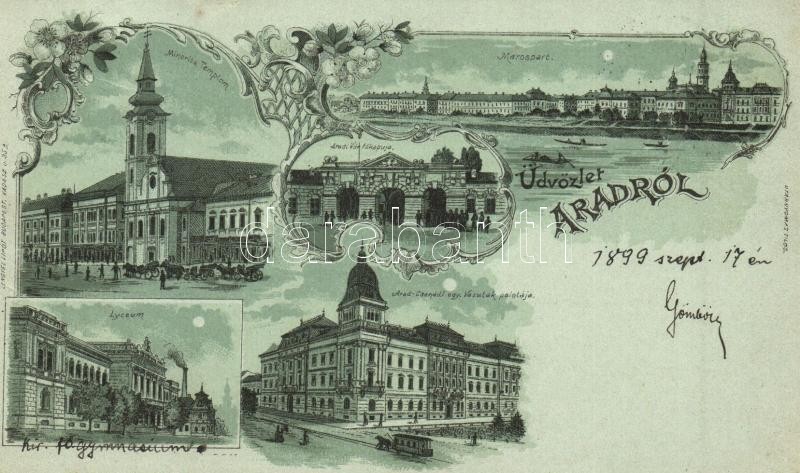 1899 Arad, Minorita templom, Maros part, Aradi vár főkapuja, Lyceum, Arad-Csanádi egy. Vasutak palotája, lóvasút. Lengyel Lipót kiadása / church, Mures riverbank, castle gate, grammar school, railway company's palace, horse-drawn tram. floral Art Nouveau litho (kis szakadás / small tear)