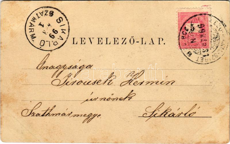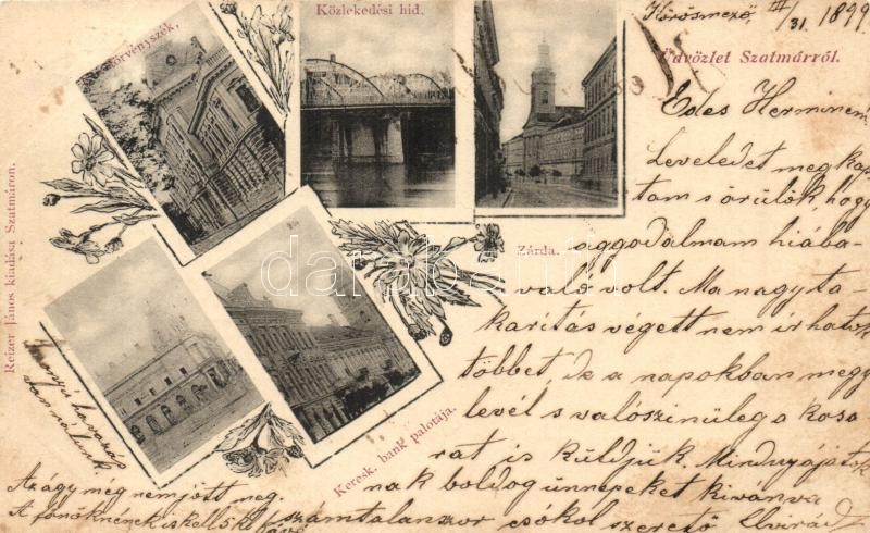 1899 (Vorläufer) Szatmárnémeti, Szatmár, Satu Mare; Közlekedési híd, Zárda, Kereskedelmi bank palotája, Kir. törvényszék. Reizer János kiadása / bridge, priory, bank, court. Art Nouveau, floral (kis szakadás / small tear) + "KŐRÖSMEZŐ-MÁRM.-SZIGET 208 SZ." vasúti mozgóposta