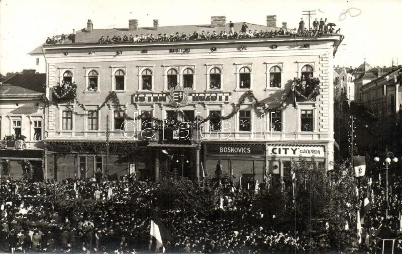 Leírás: 1940 Marosvásárhely, Targu Mures; bevonulás, Boskovics üzlete, City cukrászda / entry of the Hungarian troops, shops, confectionery. photo + Marosvásárhely visszatért So. Stpl.