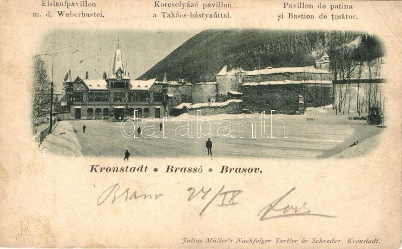 Brassó, Kronstadt, Brasov; Eislaufpavillon m. d. Weberbastei / Korcsolyázó pavilon a Takács bástya úttal télen. Julius Müller utóda Tartler és Schreiber kiadása / Pavillon de patina si Bastion de tesator / ice skating pavilion in winter, ice skaters, bastion (EK)