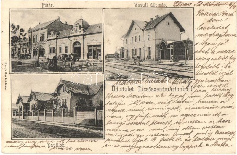 Leírás: Dicsőszentmárton, Tarnaveni; vasútállomás, Fő tér, pavilon. Hirsch Mór kiadása / railway station, main square, pavilion