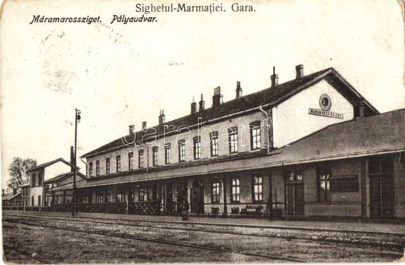 Leírás: Máramarossziget, Sighetu Marmatiei; vasútállomás / railway station / Gara "vissza" So. Stpl (Rb)