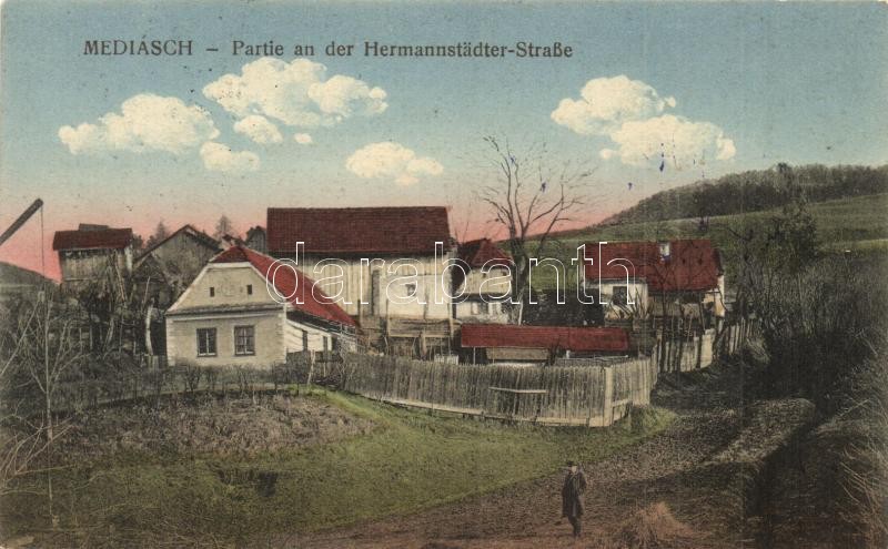 Leírás: Medgyes, Mediasch, Medias; Partie an der Hermannstädter Straße / Nagyszebeni út. Fritz Guggenberger kiadása / street view