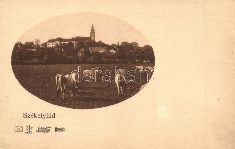 Leírás: Székelyhíd, Sacueni; látkép szarvasmarhákkal / general view with cattle (EB)