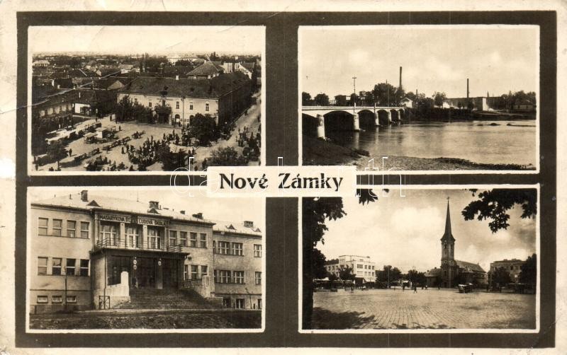 Leírás: Érsekújvár, Nové Zámky; Fő tér, piac, iskola, templom, híd / multi-view postcard: main square, market, school, church, bridge (EK)