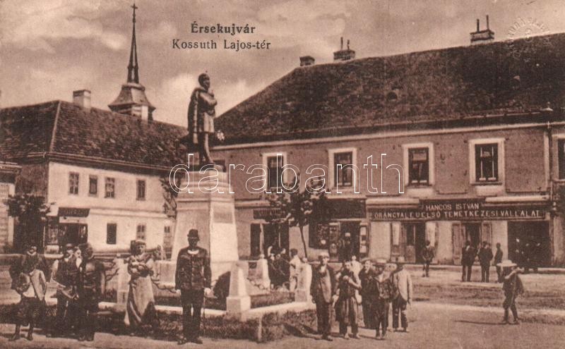 Leírás: Érsekújvár, Nové Zámky; Kossuth Lajos tér, Kossuth-szobor, Hangos István temetkezési vállalata, üzlet / square, statue, shop, funeral company