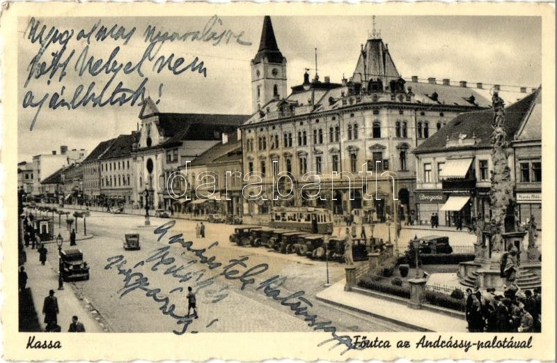 Kassa, Kosice; Fő utca, Andrássy palota, villamos, drogéria / main str... https://www.darabanth.com/hu/308-Gyorsarveres/308.0/Kepeslapok/Felvidek~400009/Kassa-Kosice-Fo-utca-Andrassy-palota-villamos-drogeria-main-street-palace-tram-shops-p~II1642155
