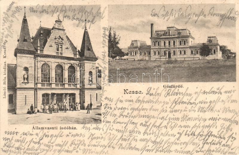 Leírás: Kassa, Kosice; Vasútállomás, Gőzfürdő. László Béla kiadása / spa, railway station (EK)