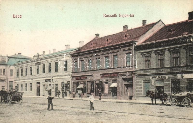 Leírás: Léva, Levice; Kossuth Lajos tér, Weisz Salamon, Teiner Andor, Engel József üzletei / square, shops
