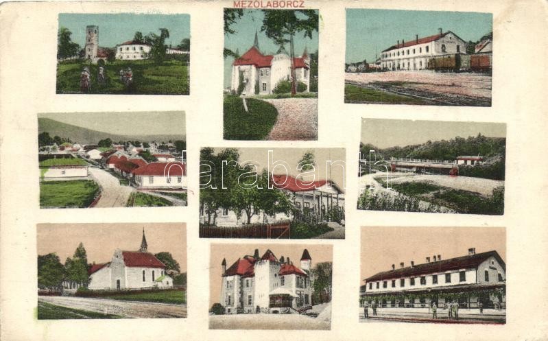 Mezőlaborc, Medzilaborce; mozaiklap, rajta vasútállomás Hoyos és Skoda kastélyok, Római katolikus templom és iskola. Fogyasztási szövetkezet kiadása / multi-view postcard with railway station, castles, catholic church and school
