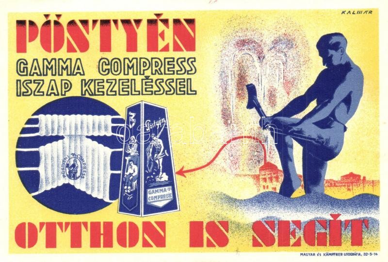 Leírás: Pöstyén, Pistyan, Piestany; A pöstyéni Gamma Kompress iszapkezelés reklámlapja. Magyar és Kämpfner litográfia / spa mud-cure compress advertising card s: Kalmár
