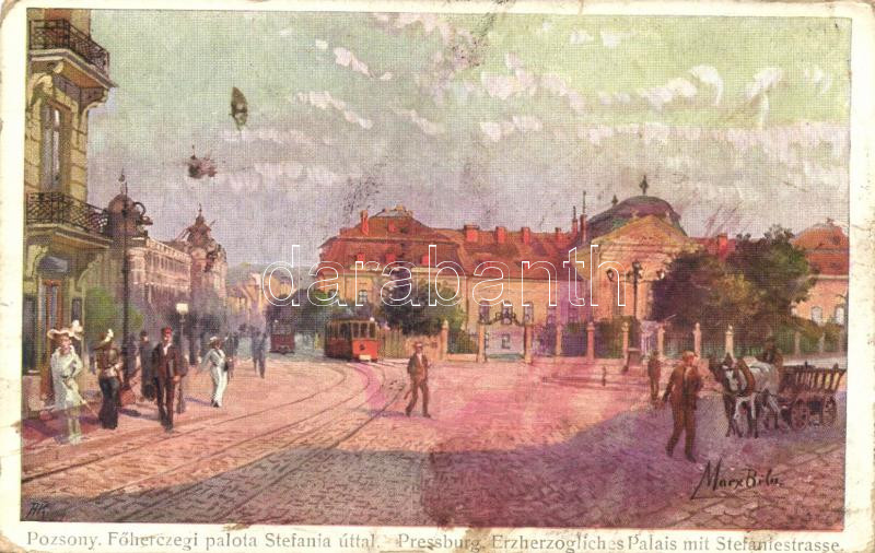 Leírás: Pozsony, Pressburg, Bratislava; Főhercegi palota, Stefánia út, villamos / royal palace, street, tram s: Marx Béla (EK)