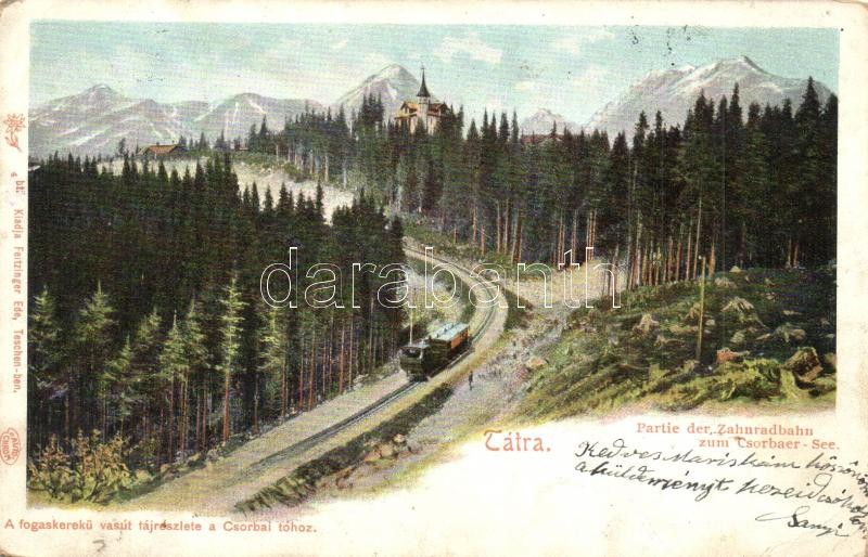 Leírás: Tátra, Csorba, Strba; Fogaskerekű vasút tájrészlete a Csorba-tóhoz. Feitzinger Ede kiadása / Zahnradbahn / cogwheel railway, funicular (EK)
