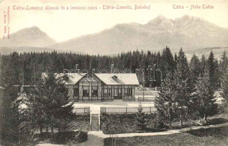Leírás: Tátralomnic, Tatranska Lomnica; Vasútállomás és a lomnici csúcs / Bahnhof / railway station, mountain peak
