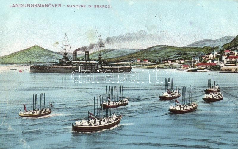 Partraszállási gyakorlat, egy motorhajó húzza a tengerészekkel teli csónakokat / Landungsmanöver / Manovre di sbarco / K.u.K. Kriegsmarine, Austro-Hungarian Navy training, one motor boat pulling the landing mariners' boats. G. Fano, Pola + K.u.K. III. Seebataillon 10. Marschkompagnie (EK)