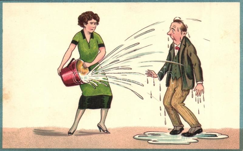 Leírás: 2 db régi humoros litho képeslap, házaspár humor / 2 pre-1945 humorous postcards, husband-wife humor, litho (HWB Ser. 3007. & 3575.)