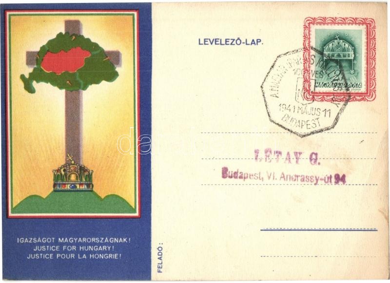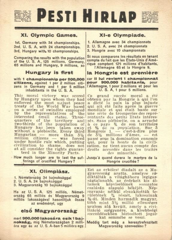 Leírás: Igazságot Magyarországnak! hátoldalon Pesti Hírlap XI. Olimpiai cikke / Hungarian irredenta, XIth Olympic Games article on the backside, So. Stpl (EB)