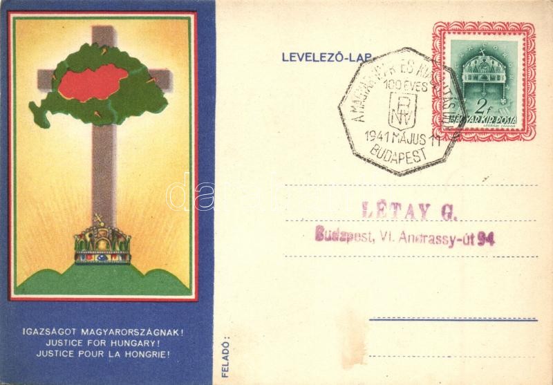 Leírás: Igazságot Magyarországnak! hátoldalon Pesti Hírlap XI. Olimpiai cikke / Hungarian irredenta, XIth Olympic Games article on the backside, So. Stpl (EK)