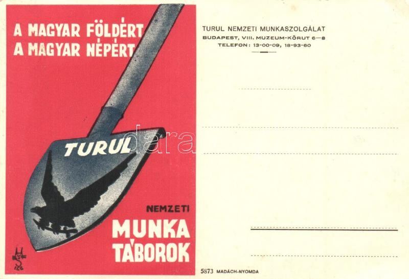 Nemzeti Munkatáborok: A Magyar Földért, A Magyar Népért. A Turul Nemzeti Munkaszolgálat irredenta reklámlapja / Hungarian irredenta, labor camp advertising card (EK)