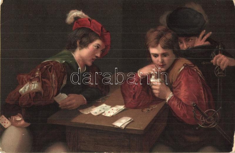 Leírás: Der Falschspieler' / 'The Cheater' card game, Stengel 29723. litho s: Michelangelo da Caravaggio (worn corners)