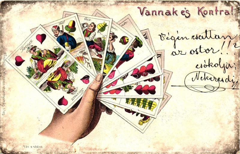 'Vannak és kontra' magyar kártyás képeslap; kiadja Ferenczi ... https://www.darabanth.com/hu/308-Gyorsarveres/308.0/Kepeslapok/Kartya~400066/Vannak-es-kontra-magyar-kartyas-kepeslap-kiadja-Ferenczi-B-Tell-playing-cards-litho~II1026225