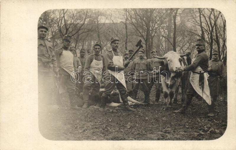 1915 Oroszország. Friss hús a tábori konyhához, katonák marhavágás közben / WWI K.u.K. soldiers at the Russian front during beef slaughter for the field kitchen. photo (EK)