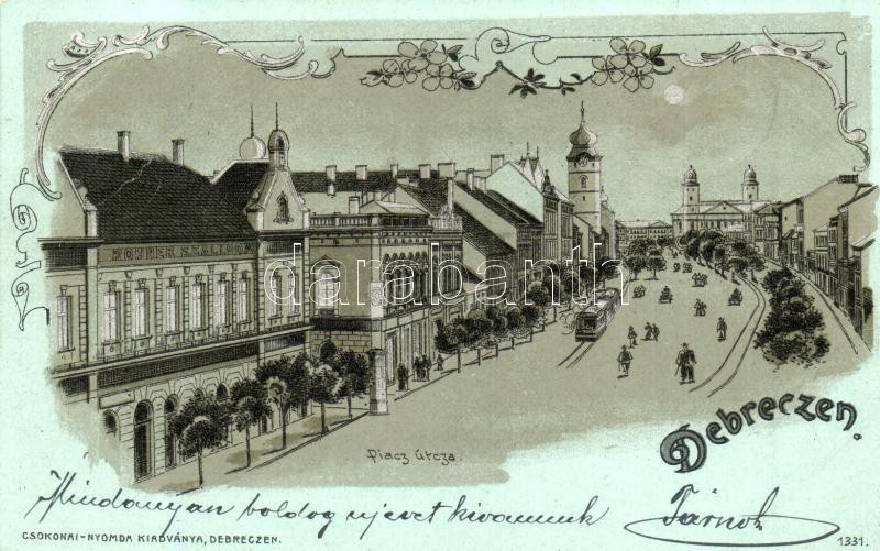 Leírás: 1902 Debrecen, Piac utca, Rohner szálloda, városi vasút, kisvasút, vonat este. Csokonai Nyomda kiadványa, Art Nouveau floral litho (EB)