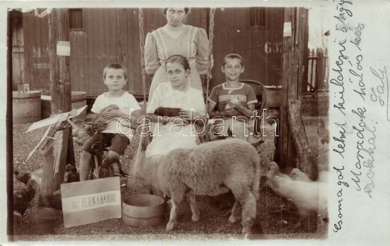 1914 Gyálpuszta (Gyál), családi csoportkép állatokkal, Éljen a háború!... https://www.darabanth.com/hu/308-Gyorsarveres/308.0/Kepeslapok/Magyarorszag~400007/1914-Gyalpuszta-Gyal-csaladi-csoportkep-allatokkal-Eljen-a-haboru-feliratu-tablaval-~II1675911