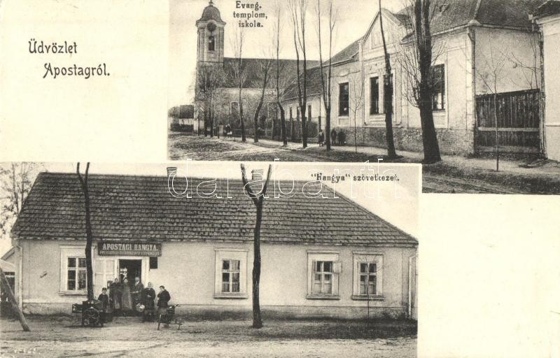 Leírás: Apostag, Evangélikus templom és iskola, Hangya szövetkezet és kiadása