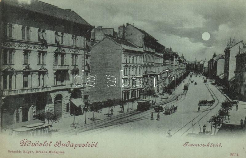 Budapest IX. Ferenc körút, villamosok. Schmidt Edgar kiadása (EK) https://www.darabanth.com/hu/308-Gyorsarveres/308.0/Kepeslapok/Magyarorszag~400007/Budapest-IX-Ferenc-korut-villamosok-Schmidt-Edgar-kiadasa-EK~II1671035