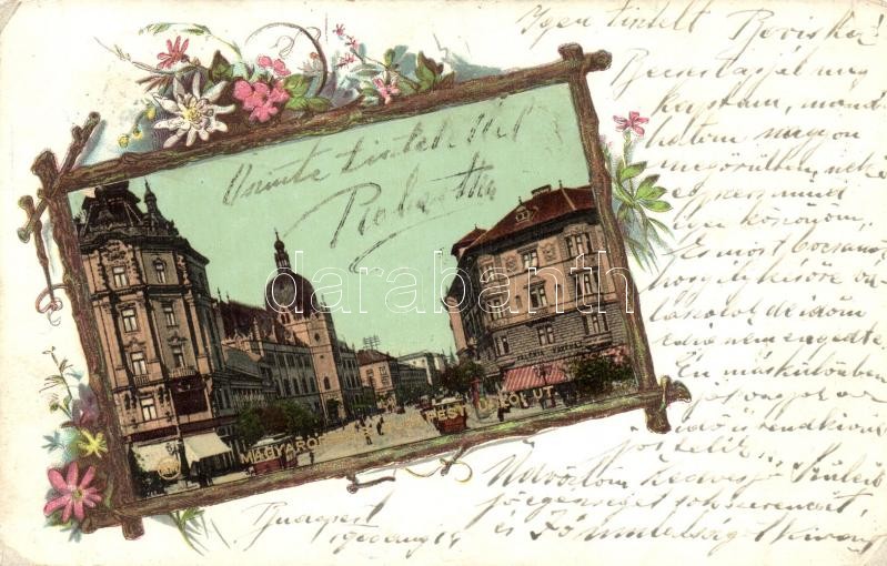 Leírás: Budapest IX. Üllői út, Iparművészeti Múzeum, villamosok, Valéria Kávéház. floral Art Nouveau litho frame (kopott sarkak / worn corners)